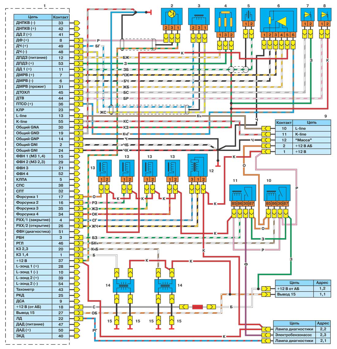 15 – электромагнитный клапан ЭПХХ 62 – контрольная лампа дальнего света фар