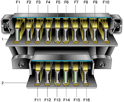 - №1 защищает цепи звукового сигнала, часов, стоп-сигналы, прикуривателя, фонари сигнализации открытых передних дверей. Номинал предохранителя 16А.
