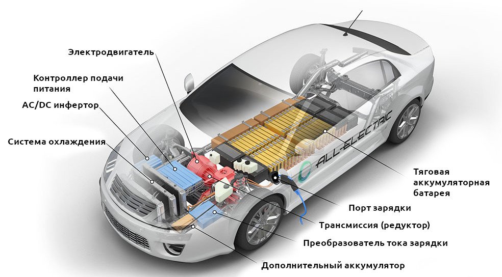 Электрический автомобиль имеет упрощенную конструкцию по сравнению с традиционным автомобилем. Основные элементы:
