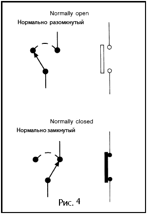 На рисунку показано изображение в схеме нормально разомкнутых и нормально замкнутых контактов, это состояние, когда через обмотку реле не протекает ток.