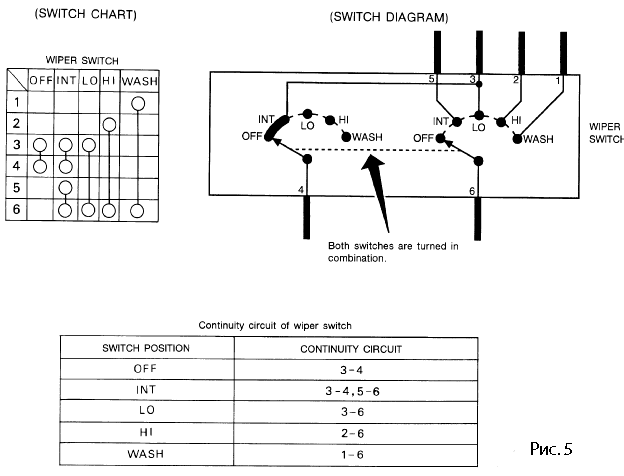 На рисунку показан переключатель стеклоочистителя в виде графического рисунка и двух таблиц. На рисунке показано схематически внутренние соединения переключателя. Таблицы нам описывают работу переключателя, как “чёрного ящика”, неизвестно как реализуется схема внутри, но на выходе состояние контактов соответствует указанным в таблице, для режимов: