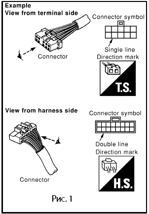 Рядом с рисунком разъёма располагается обозначение с какой стороны разъёма его рассматривать, со стороны контактов (Terminal Side) (T.S.) или со стороны жгута (Harness Side) (H.S.). Обратите внимание, что контур разъёма, где контакты рассматриваются со стороны проводов обведён линией.