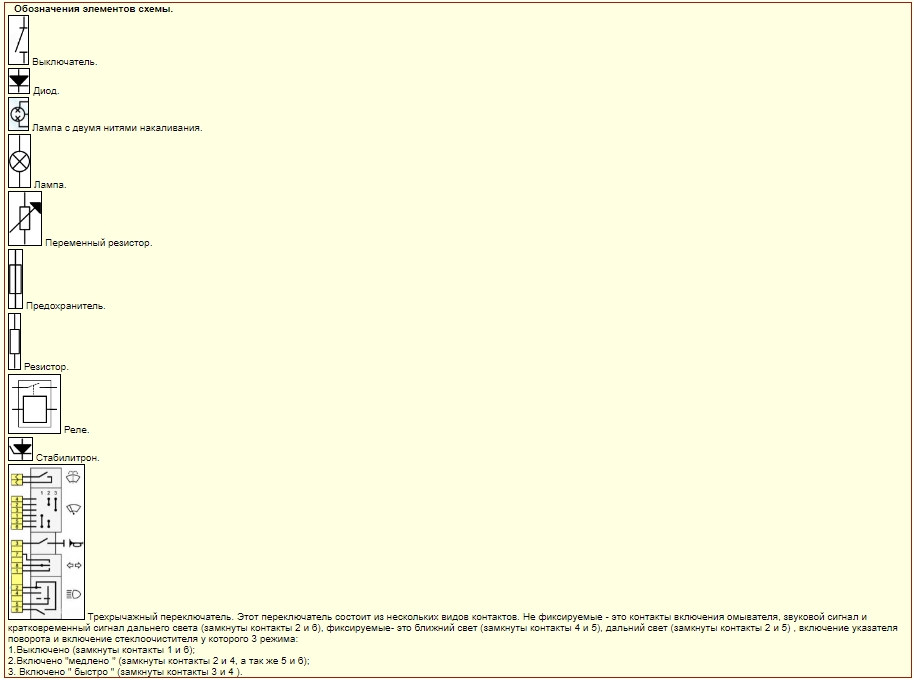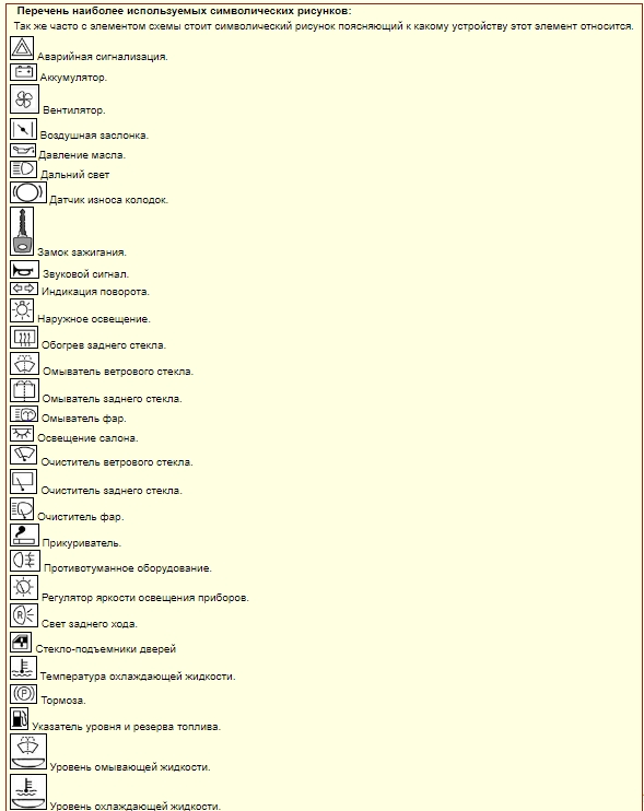 Что бы понимать содержимое схемы автомобилей, нужно знать соответствие между символами схемы и реальными элементами устройства. Какие функции эти устройства выполняют и как между собой взаимодействуют.