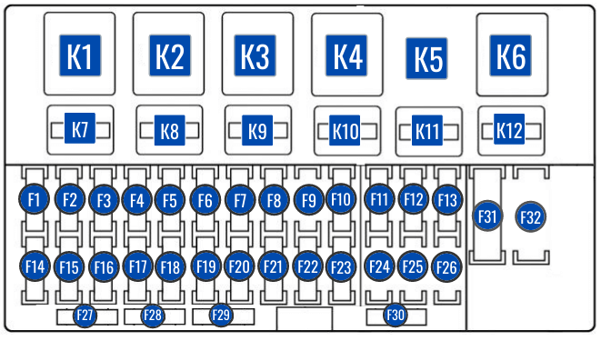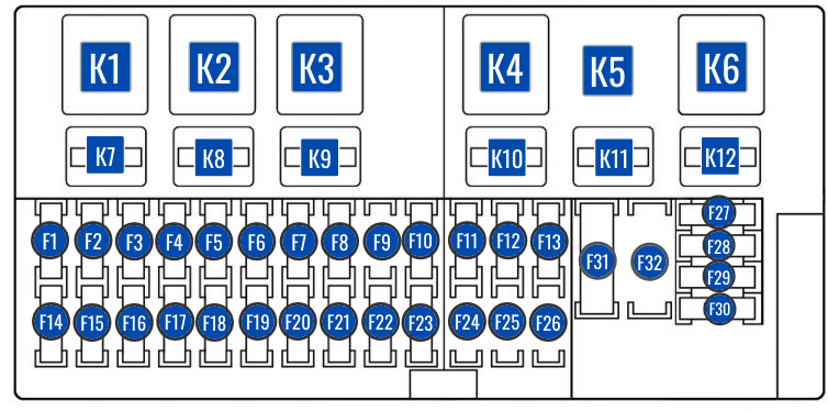 | K11 | С 2007г.в.: Реле обогрева / подогрева сидений водителя и пассажира ; С 2013г.в.: Реле задних противотуманных огней |