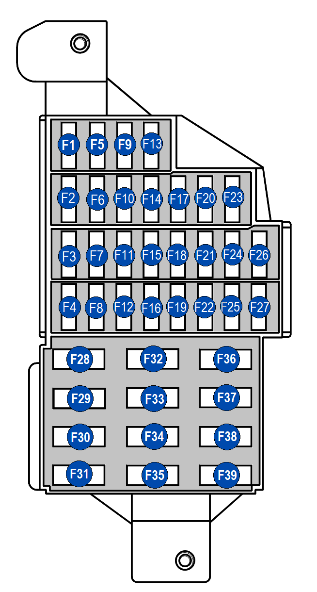 | F37 | 30А / – | 30А: Стартер (модели с механической коробкой передач); Цепь втягивающего реле стартера; либо Пусто (резерв) |