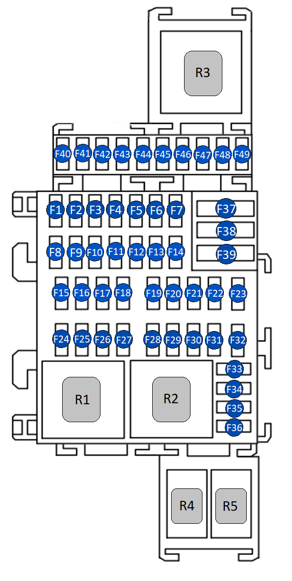| F5 | 40 А | Вентилятор радиатора – на реле малой / низкой скорости вентилятора сис-мы охлаждения двигателя R3 |