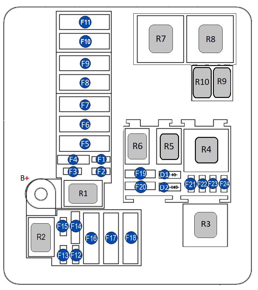 | F23 | 5 А | Выключатель регулятора и ограничителя скорости движения (Круиз контроль); Реле дополнительного отопителя салона №1 и №2; Сигнализатор не пристегнутого ремня безопасности; На реле обогрева / подогрева заднего стекла и боковых зеркал заднего вида; На реле левого элемента обогрева лобового (переднего) стекла; Парктроник – ЭБУ системы контроля парковки; Электроприводы блокфары, Корректор / регулировка угла наклона света фар |