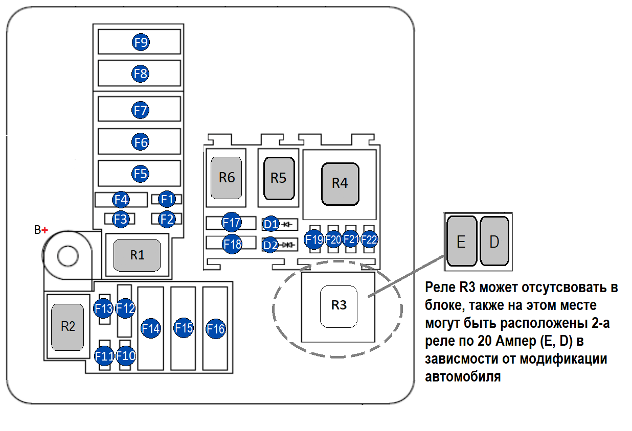 | R6 | 20 А | Реле противотуманных фар (птф) (*некоторые модели) |