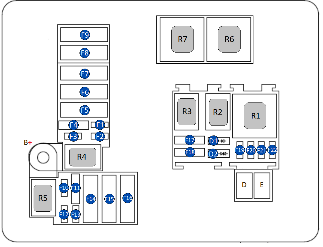 | F13 | – / 20А или 70А | Пусто (резерв); Либо: предохранитель подготовки для подключения разъема электропроводов двигателя / сис-мы впрыска в модификациях с двигателями D4F734 (20А) и H4B410 (70А); 70А: Предпусковой подогрев на дизельных двигателях; и пред-ль АКП на бензиновых двигателях |