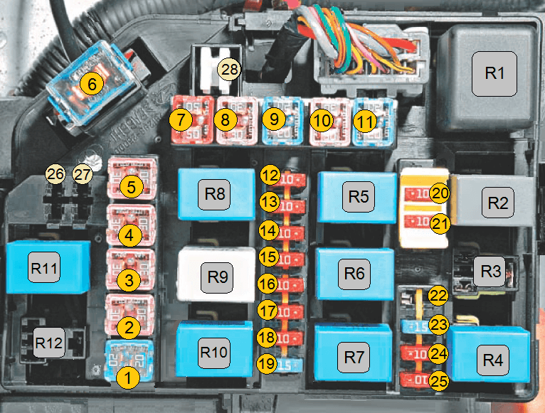 | R12 | – | Реле дневных ходовых огней (дхо) – постоянно включенного ближнего света фар (DRL) |