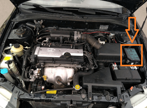 Расположен в моторном отсеке между аккумуляторной батареей (АКБ) и стойкой амортизатора