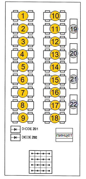 | Diode Z01 | – | Диод Z01 – на выключатель передних птф. (см также пред-ль №19 под капотом) |